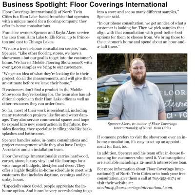 Spencer is the owner of FCI North Twin Cities, and has lived in and been involved within his community for his entire life. Driven by a desire to offer superior products and unparalleled service, Spencer joined the Floor Coverings International family in 2022. Spencer’s unwavering commitment to excellence and customer satisfaction has made him a trusted partner for homeowners, realtors, and contractors alike. Beyond running his business, Spencer is deeply involved in his community, supporting local initiatives and fostering relationships with fellow entrepreneurs. Whether he’s helping a client find the perfect hardwood for their dream home or advising on the latest trends in luxury vinyl tile, Spencer’s dedication to his craft shines through in every interaction. When he’s not busy transforming spaces with stunning flooring solutions, Spencer can be found spending time with his family and friends, traveling or catching a round of golf.
